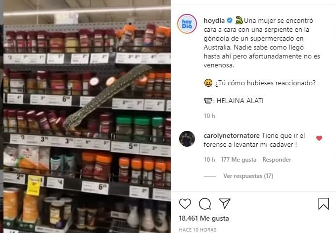 Imaginese ir de compras y encontrarse con una serpiente, eso fue justo lo que le paso a una mujer quien se encontró con el reptil de 10 pies en la estantería de un supermercado.